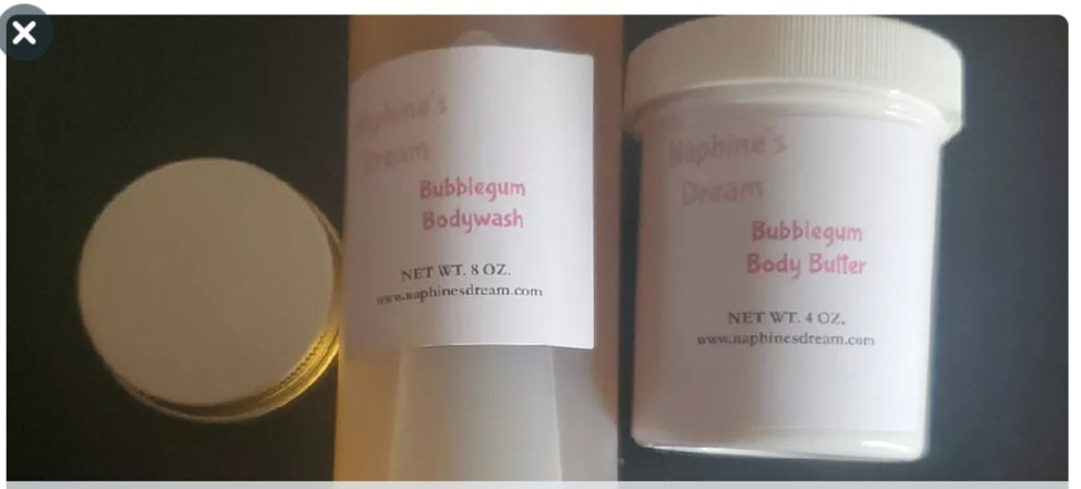 Comes with 8oz of bodywash, 4oz of body butter, lipbalm and loofah. Smells just like bubblegum without the sticky mess!